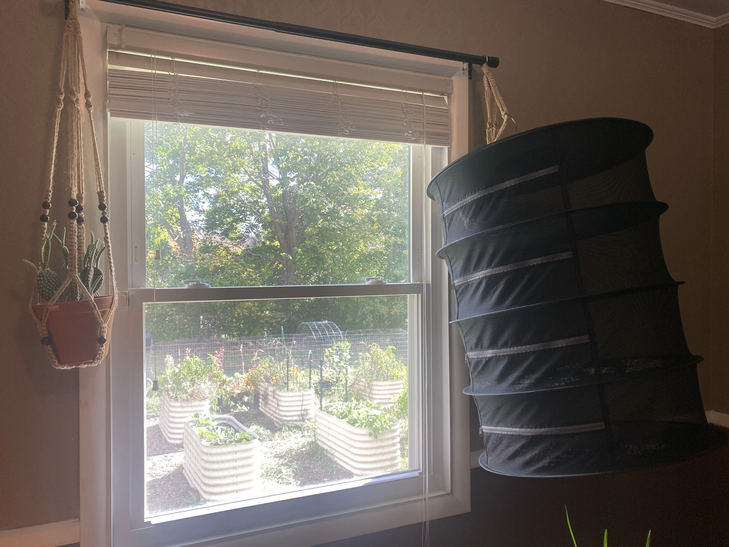 We use the AC Infinity 4 Tier Herb Drying Rack (affiliate link), which is collapsible and easy to store away during the winter. It hangs from a hook in our ceiling or a curtain rod throughout the spring and summer and we can throw our herbs and flowers for tea in them throughout the growing season. We often wish we had more space because our herb and tea gardens keep expanding, so consider the AC Infinity 6 Tier Herb Drying Rack (affiliate link) if you grow a lot of herbs.