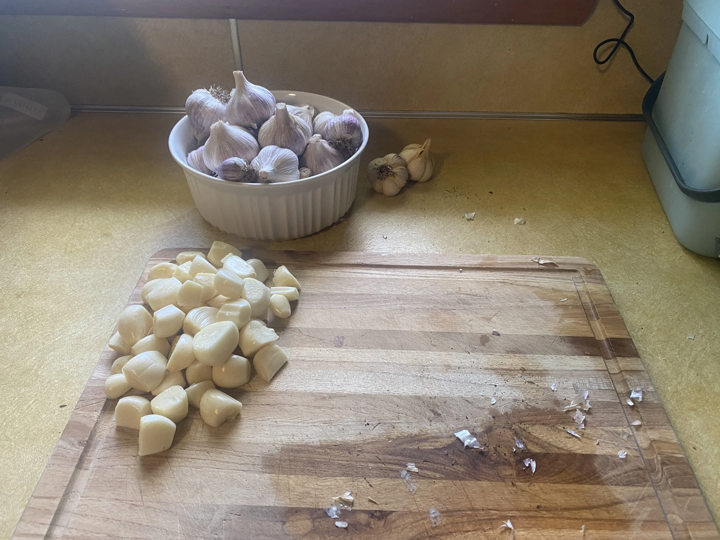 If you’re growing garlic, the odds are that you’ll get some bulbs that are not very large or some that have damage. We like to store some of the largest cloves to replant in the fall since those are more likely to create larger bulbs in the next harvest. For the smaller garlic bulbs, you can cure and store the garlic or you preserve it for later use. We like to take the smallest and damaged bulbs and chop them in a food processor. We then freeze all of the minced garlic in a bag so we can break off pieces to use in our cooking. You can also dehydrate the garlic bulbs and grind them in a spice grinder to create homegrown garlic powder.